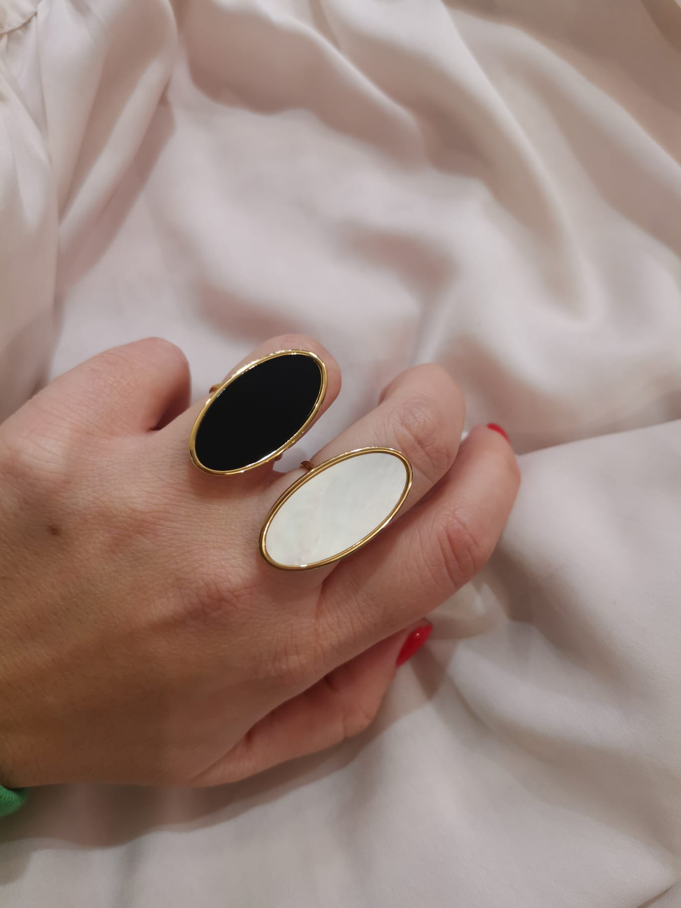 Anello ovale regolabile con pietra nera e bianca madre perla in acciaio chirurgico inossidabile e anallergico