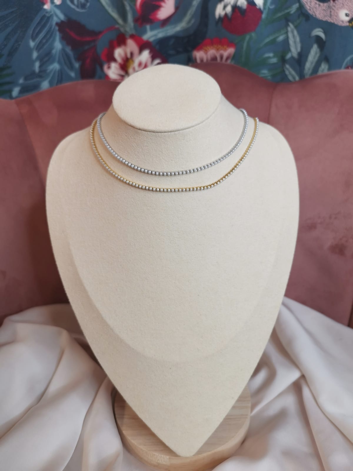 in modo da poterla indossare  girocollo o come choker.