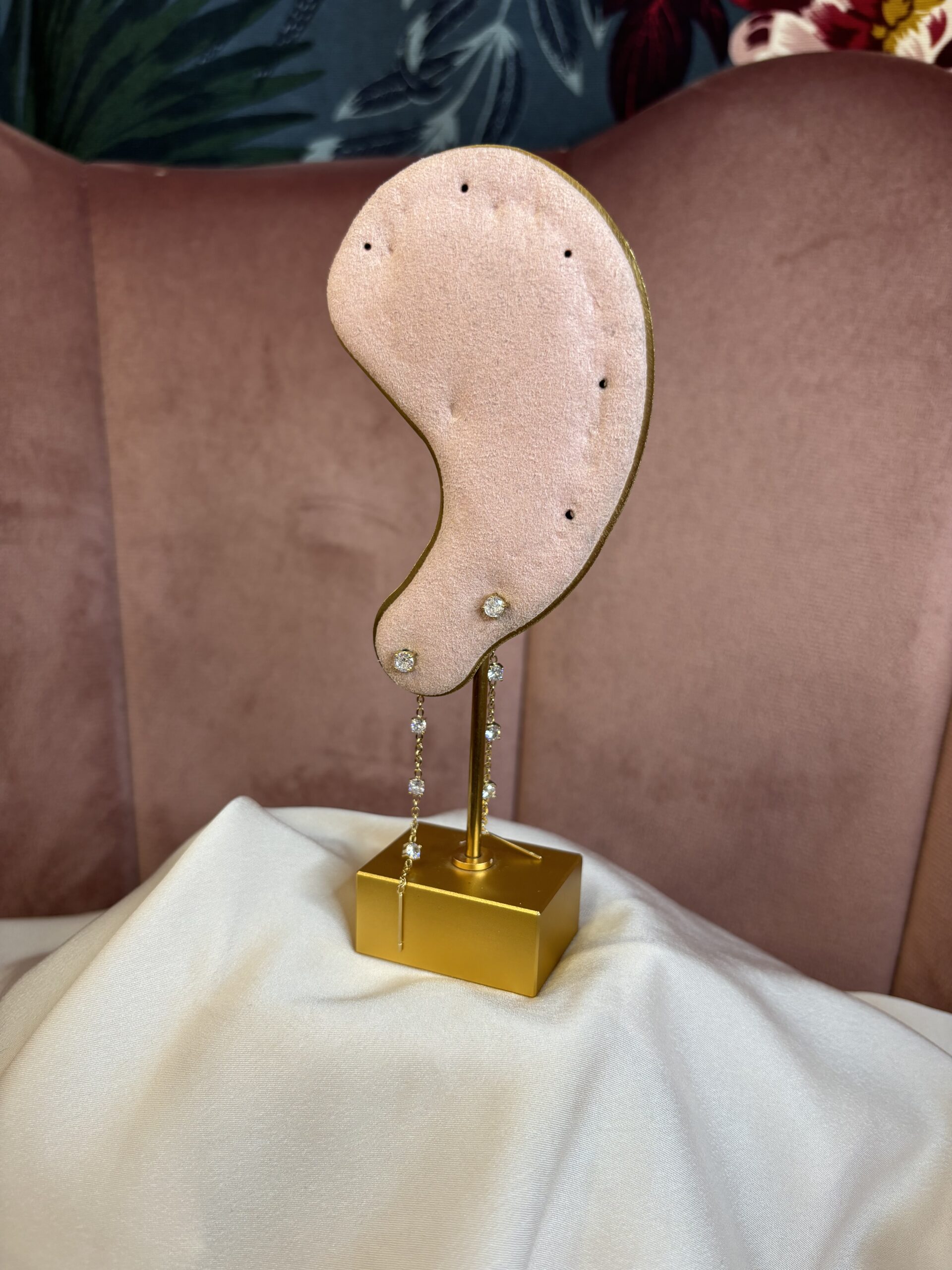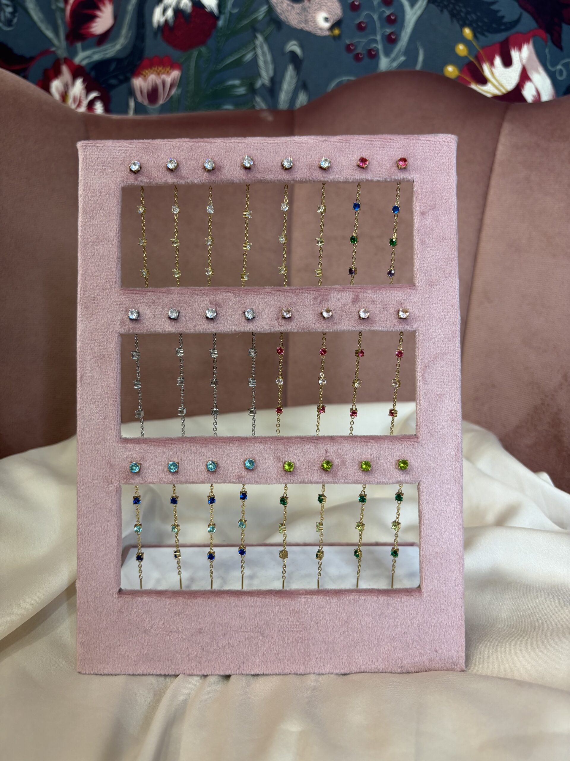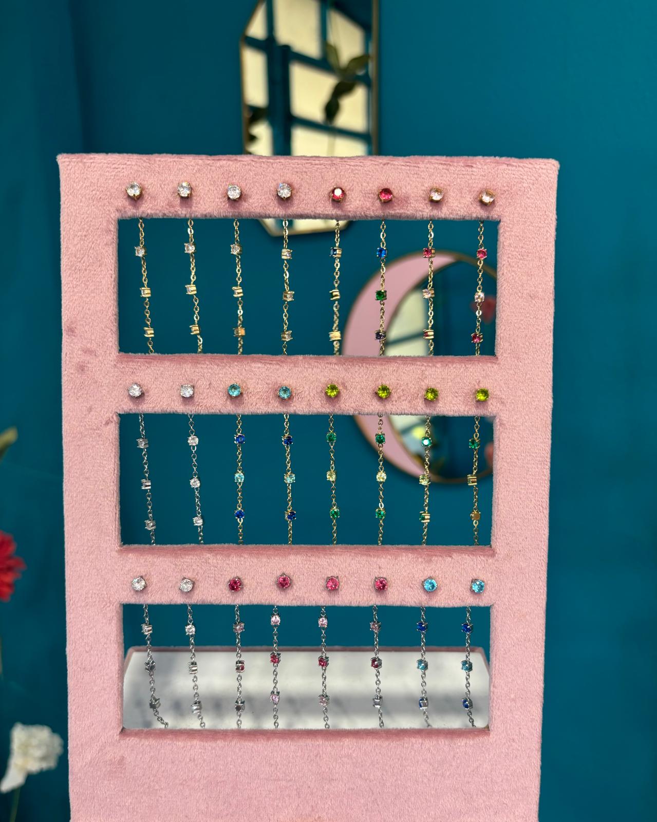 Coppia di orecchini saliscendi shine, disponibili oro e argento con punti luce bianchi, e oro con punti luce nei toni del blu/azzurro e dei verdi, rosa e multicolore, in acciaio inossidabile anallergico
